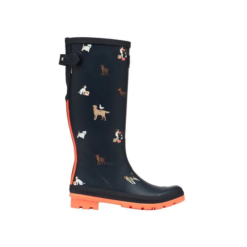 Joules Printed Wellies With Adjustable Back Gusset Ladies Navy Beach Dogs Size 3 - Navy Beach Dogs