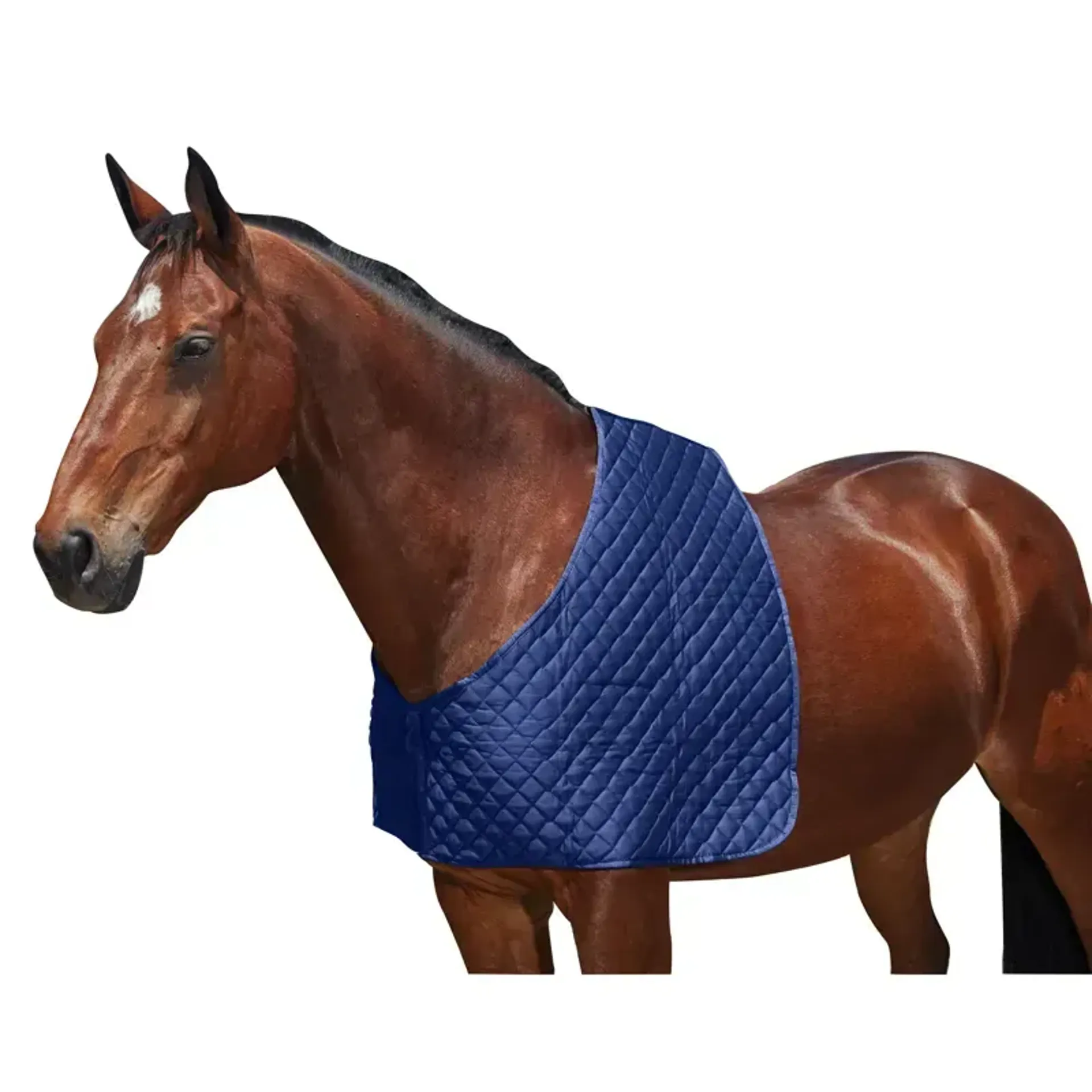 This shoulder guard has a diamond quilted polycotton outer with polyfill to provide padding. It slips on easily over the horse's head, featuring a smooth satin lining for greater protection against rubbing.