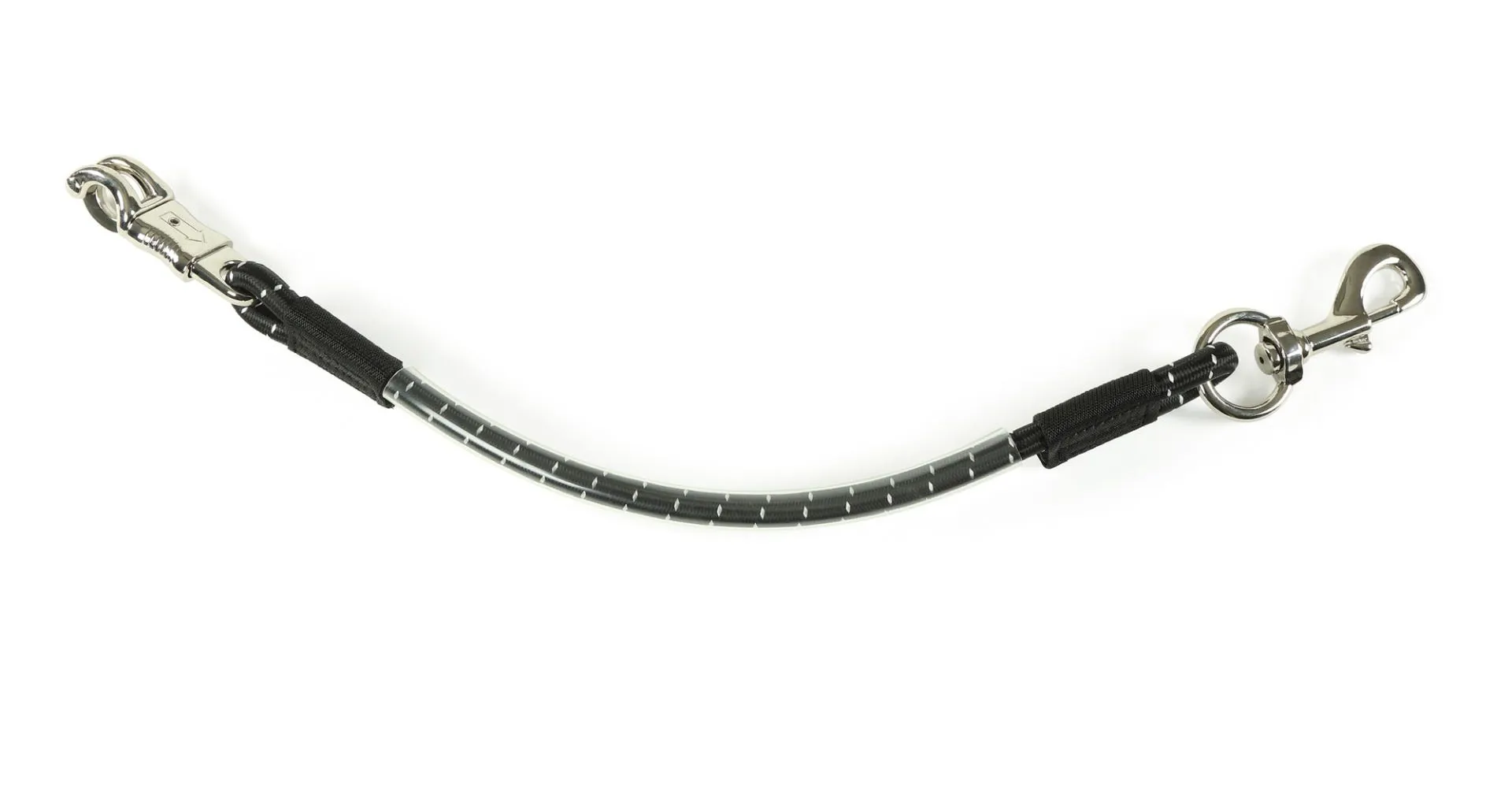 This calming, shock absorbing robust bungee line quickly tethers the horse in the stable, yard, or trailer.